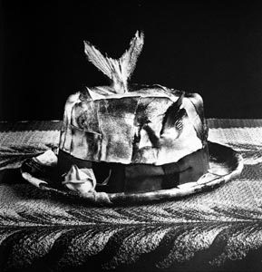 "Yellowtails and Hat"Kon presents an affirmation of the material that truly makes up our world (its living creatures) and its subjugation for our own purposes. These are rather banal, but dramatically portrayed, fashion images except for her materials. By using fragments of (and often whole) birds and sea creatures, she speaks of the lives we take to support our society, as well as reversing the common roles of food and clothing. With the previous example, there is at once a disgust by the dead fish, but would we think twice of putting this same animal on a plate? Somehow, this relocation causes our sensibilities to revolt, ultimately provoking us to question the distinctions we put on life and death. Only further complicating the matter is the vitality and the moisture that these objects have. While they are dead creatures, the misty, gleaming quality of their surface suggests to us that this new object is somehow still alive.
