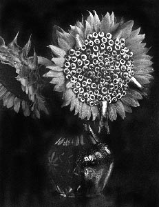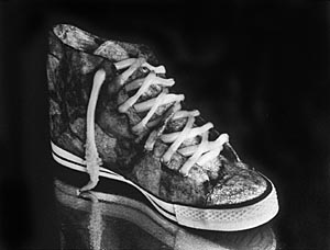 "Sunflowers and Sardines"Kon works visually in a very limited, flat space and the range of her constructions mirrors the visual distance of her obsessions: she never strays far from home. "Sunflowers and Sardines," a vase with 2 sunflowers, the center of the largest one being made of fish eyes, and a couple of sardine tails for petals, could be the bounty from a morning stroll through the garden if it weren't for the lack of visual context. "Gizzard Shad and Brassiere," rests gently draped over an elaborate, dark chair, waiting for an illicit liaison or the laundry. The image is carefully constructed to be suggestive, not complete. The sparse compositions are as important to the domestic, local feeling in these pictures as are the immaculate creations photographed. "Cuttlefish and Sneaker" could pass for a catalog shot of a Converse shoe, but the texture and the shine of the cuttlefish (a small, squid-like creature) challenges our tactile senses by replacing the familiar canvas with flesh. The effect is as repulsive as it is seductive.